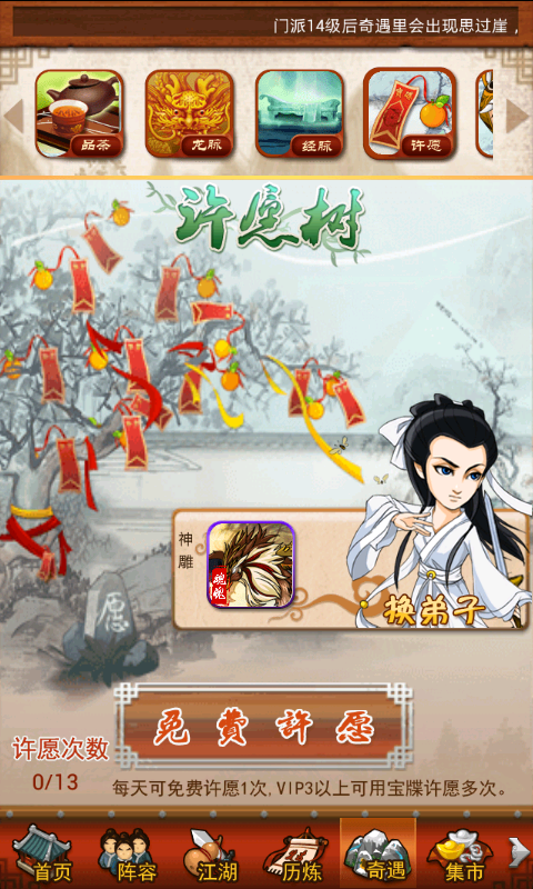 2013年圣诞节你的愿望是什么?年终奖翻翻?心动女神投怀送抱?买彩票中五百万......大胆喊出来,《大掌门》圣诞节许愿活动圆你所愿,凡参与许愿活动的玩家都有机会获得海量Q币包、话费充值卡、双诞礼包、甲级武功包等诸多超值礼品,《大掌门》最跪爽旦活动第一弹开炮,小伙伴们赶紧加入分享饕餮盛宴吧!