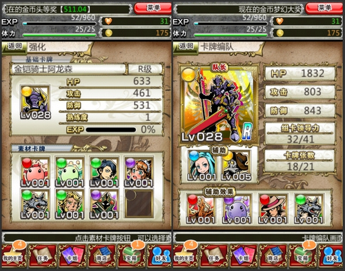 在卡牌玩法上,《金币传说》与《智龙迷城》均含有卡牌收集、养成、战斗等传统经典元素。在《金币传说》里,玩家可以收集超过250种造型各异、超萌养眼的卡牌类型,并提升其等级与品阶;品阶越高的卡牌,战力越强,且外形更加绚丽夺目。而且,此游戏的卡牌不仅有职业之分,还有着属性之别。游戏里的卡牌分为水、火、木、光、暗五种属性,并且相互克制,配合游戏职业、特殊战技等元素,让《金币传说》的卡牌对战更具战术性与竞技性。