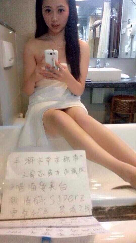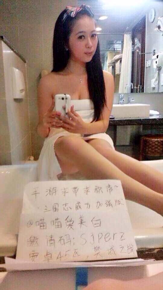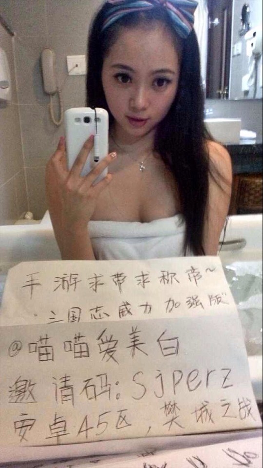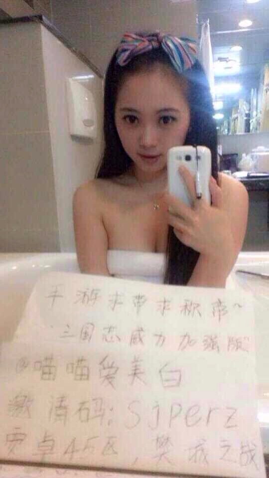 在游戏品质+公测礼包的双重品质下,公测首日就出现使出各种绝招发出自己的游戏邀请码的现象,更有安卓45区(樊城之战)女神级女玩家“喵喵爱美白”黑丝诱惑发送邀请码。从图片看出,“喵喵爱美白”不惜大秀性感乳沟,展示傲人酮体,弱弱示意:“手游求带求称帝”,并照片中附上邀请码!