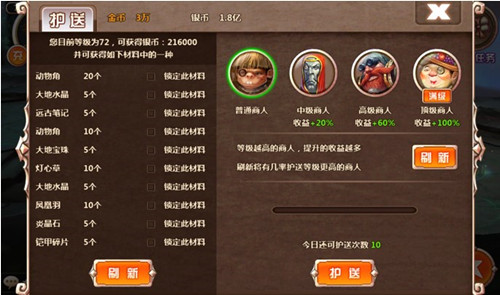 导 读: | 行商走天下,护送赢惊喜 !装备、魔药作为《天神传》中玩家提升战力必备的主要系统,需要玩家通过积攒大量材料进行合成或升级。商队护送系统作为一项极富特色的游戏系统,玩家 |