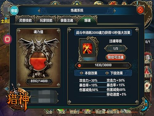 炼魂系统可以注入魂魄,带来属性加成。玩家等级达到10级之后,刷副本砍BOSS都会有魂力收集,系统每天也会免费赠送玩家1000魂力。在玩家技能升级、灵兽技能升级、玩家装备注魂和爆魂等方面魂魄都有不可替代的强力功效。