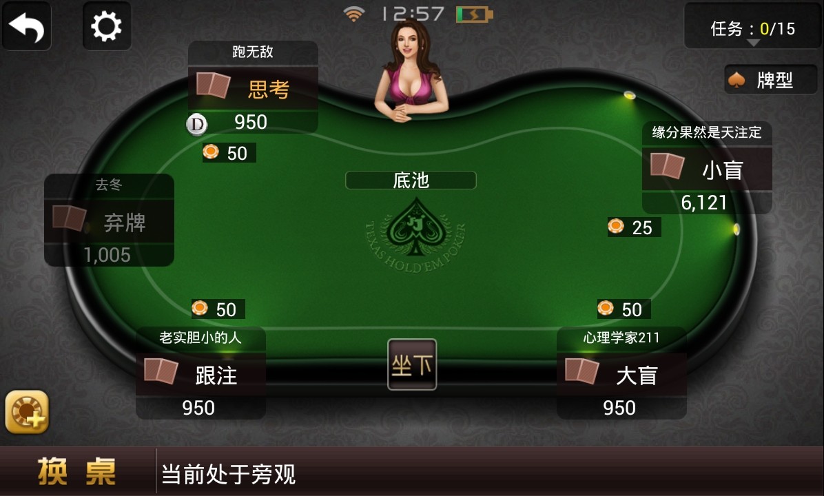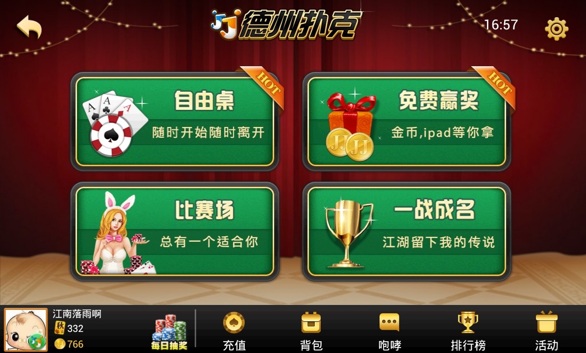 玩德州扑克最怕的是什么?是等待,新版JJ德州扑克在自由桌中新增了换桌功能,让你快速完成换桌,快速加入牌局进行激战!