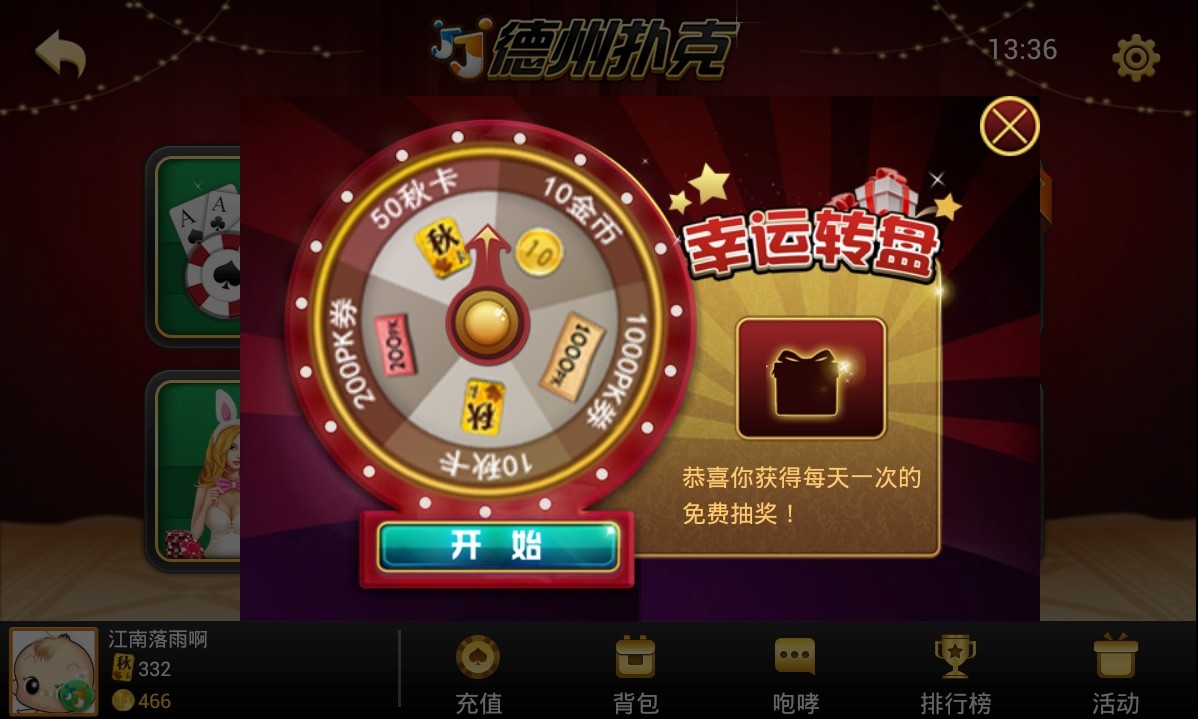 幸运大转盘是JJ德州扑克对活跃玩家的一种回馈手段,绝对的100%中奖。新版转盘大大加强了奖励力度,不仅奖品比之前更加给力,而且大额奖品的中奖概率也提升了不少哦,保证让你每天都能抽出不一样的惊喜!抽奖获得的秋卡可以换取话费及实物奖励,金币和PK券可以参加锦标赛哦