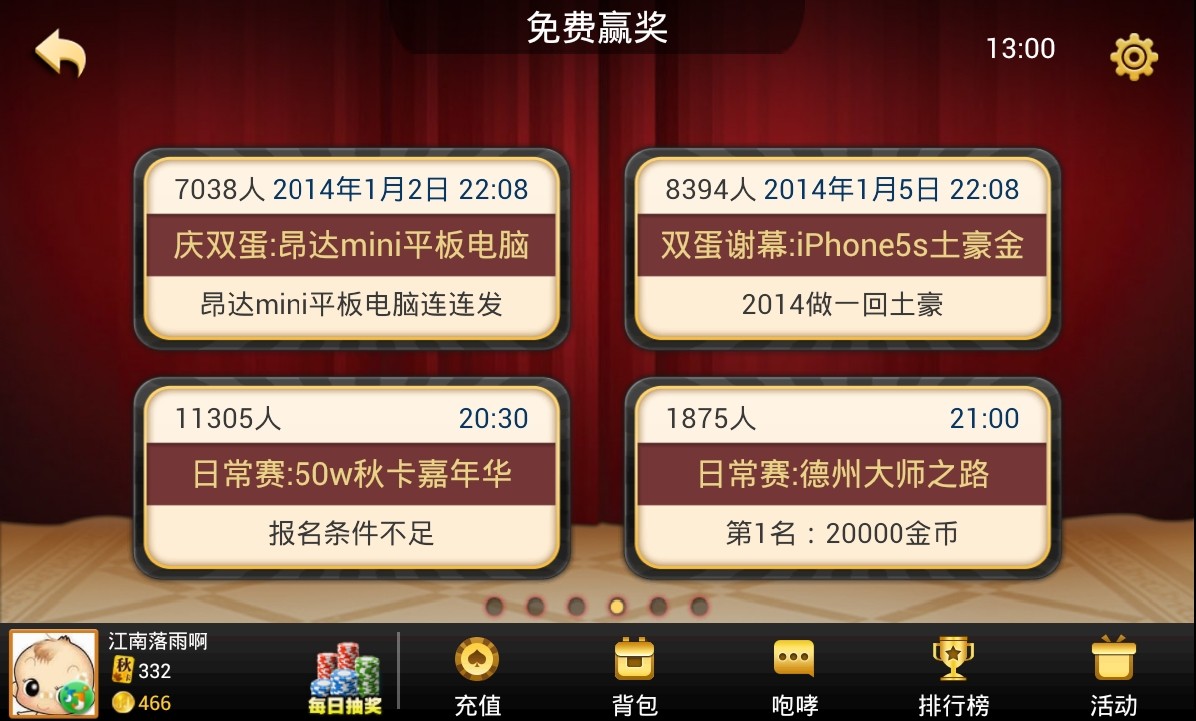 2014即将来临,你还想着和土豪当朋友?双蛋节(圣诞节、元旦节)来JJ德州扑克即可成为羡煞他人的超级土豪!2013年12月20日至2014年1月5日,JJ德州扑克重磅推出土豪金大奖赛,同时现金红包、小米3、mini平板、红米手机应有尽有,每天都有大奖赛,千万不能放过哦!