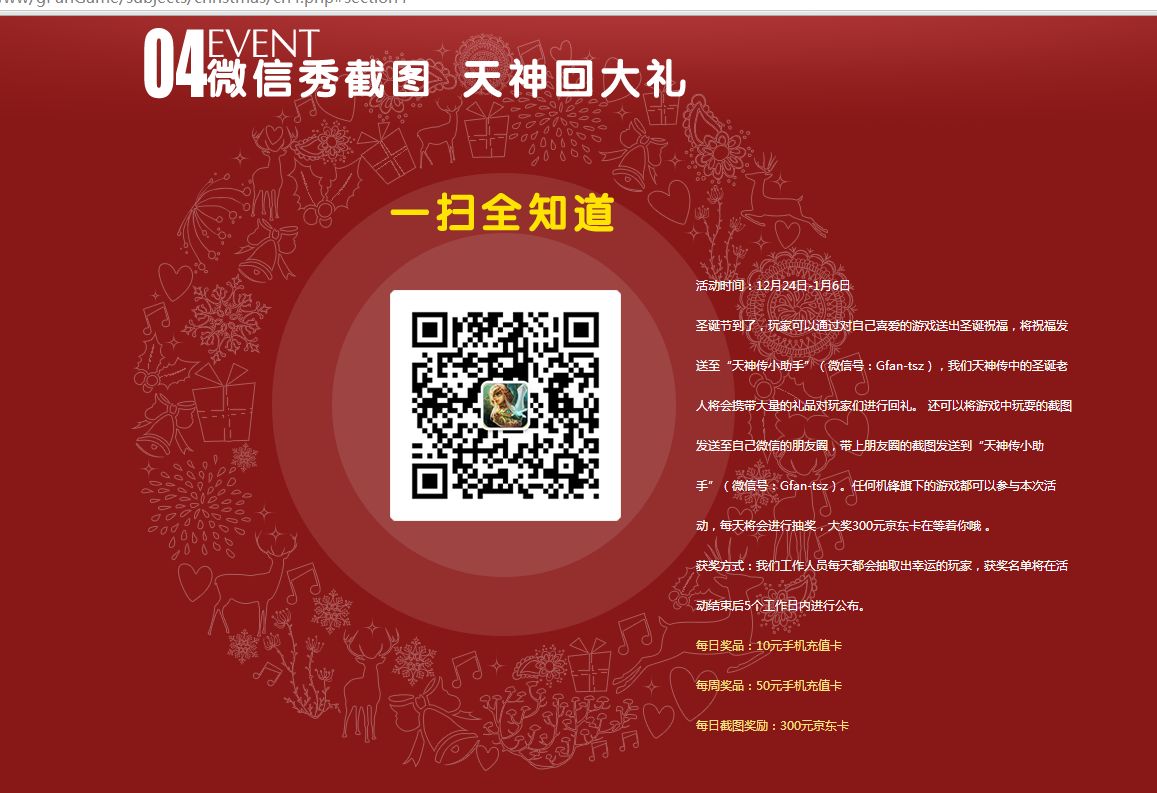 圣诞节到了,玩家可以通过对自己喜爱的游戏送出圣诞祝福,将祝福发送至“天神传小助手”(微信号:Gfan-tsz),我们天神传中的圣诞老人将会携带大量的礼品对玩家们进行回礼。还可以将游戏中玩耍的截图发送至自己微信的朋友圈,带上朋友圈的截图发送到“天神传小助手”(微信号:Gfan-tsz)。任何机锋旗下的游戏都可以参与本次活动,每天将会进行抽奖,大奖300元京东卡在等着你哦 。