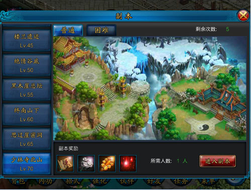 《叫我大侠》圣诞节特别版将会带来全新的60级副本:终南山下、65级副本:思过崖秘洞和70级副本少林寺北山,每个副本都有普通和困难2种模式。普通模式为单人副本,没有限时,怪物数值较低,BOSS的血量不高也不会有血量继承;困难模式为多人副本,有限时,怪物数值较高,目前最高支持4人组队,玩家可以根据自己的战力挑选合适的伙伴踏上征战副本的旅程。