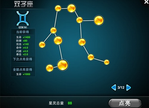 星座系统的设计完全是按照黄道十二宫的排列,每个星座都包含数个小星星,玩家需要使用星灵值用来点亮小星星,以获得属性加成,当一个星座全被点亮,还可以获得额外的属性加成,并且可以继续点亮下一个星座。