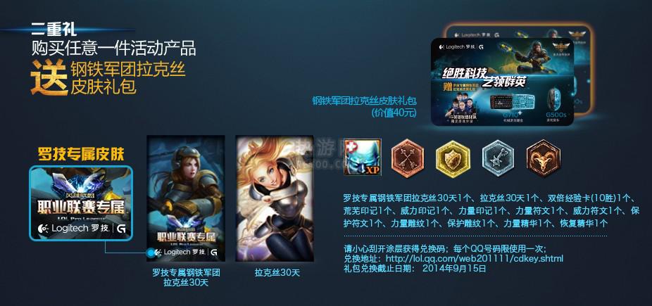 玩家只需购买使用指定促销包装的上述罗技G系列游戏外设,即可百分百获得罗技独家钢铁军团拉克丝皮肤礼包,礼包内的道具极为丰富:罗技专属钢铁军团拉克丝30天1个、拉克丝30天1个、双倍经验卡(10胜)1个、荒芜印记1个、威力印记1个、力量印记1个、力量符文1个、威力符文1个、保护符文1个、力量雕纹1个、保护雕纹1个、力量精华1个、恢复精华1个。礼包兑换码在产品外包装内侧,小心刮开图层即可获得。