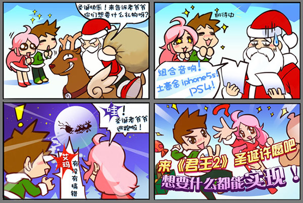 温馨的圣诞节来临,满天飘舞雪花的点缀下,坎德兰大陆到处洋溢着浓浓的节日气氛。在这个喜庆的日子里,圣诞树下微微震动的礼物中,你最希望拥有什么呢?是炙手可热的土豪金还是华丽绚烂的组合音响?如果您迫不及待拆开礼物后发现什么都没有,请您不用着急,快来《君王2》圣诞许愿吧,想要什么都能实现!