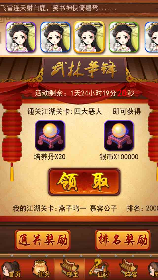闯江湖但求闻名天下,12月26日,《大掌门》闯江湖排名系统将震撼上线,活动期间,系统将根据掌门的闯关进行排名并发送对应的排名奖励,排名奖励包含大量的培养丹和银两。争夺属于你的荣耀和财富,这一次用实力让天下英雄知道你的存在!
