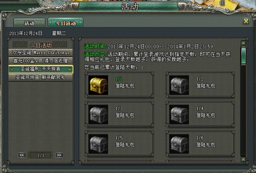 圣诞老人的福利将从平安夜奖励一直陪伴玩家到元月2日,这期间登陆《乱世天下》达到指定天数(1-10天)即可在当天获得相应的“花环礼包”(web版、ios版、android版本皆可),连续登陆天数越多,获得的奖励越多。礼包中含有金币、五位数的银币、军功,甚至有玉币、突飞令、乱世特权、古遗物、重铸之书等珍稀道具。此外,在更新维护的活动期间,通过运送粮车、护送粮车、抢劫粮车、五谷丰登获得的收益均翻2倍,而训练武将提升的经验将翻5倍,玩家可以界面直接看到翻倍后的收益数量。
