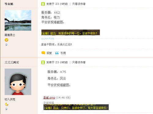 除了配合游戏内容,《乱世天下》论坛也开展了多样的顶楼活动,平安夜和圣诞夜期间,玩家将祝福发送到游戏内的世界频道、截图后并按照规定格式回复于指定活动贴内,就有机会获得平安夜祝福奖励。活动期间圣诞老人和麋鹿也会出现在活动帖内寻找幸运玩家,正确引用并回复祝福的玩家,同样可以获得大量金币、军功、银币、突飞令的奖励。
