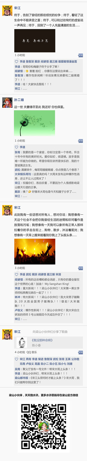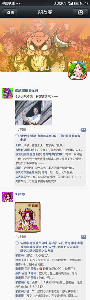 纳尼?我没听错吧,梁山上也有微信了?假如水浒里也有微信的话,小伙伴们的朋友圈里改写些什么呢?高富帅西门庆如何勾搭黑木耳潘金莲?武大郎这等屌丝怎样逆袭女神?宋江大哥又为什么非要上头条?让我们一起来看看水浒人物的微信朋友圈——