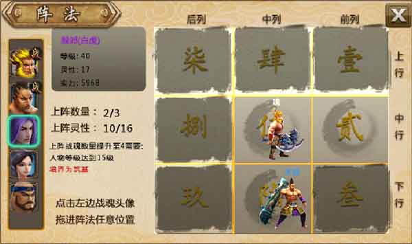 相互克制的战魂在相邻站位时,会相互制约,使得攻击力极度下降。即使只有场上青龙与白虎两位战魂也会造成不可挽回的结果。完美的阵容需要玩家充分了解中国古文化和四象知识,并深度研究之后才能找到。