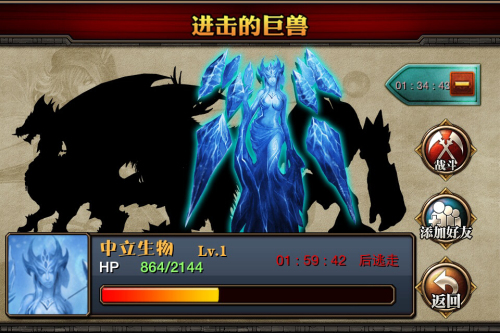 在挑战关卡的过程中,还会有一定几率发现进击的巨兽,与每日凌晨的怪物反攻不同,进击的巨兽被发现后,只会存在一定时间,不能在时限内消灭,则会逃走,与进击的巨兽战斗不需要消耗行动力,玩家如果在战斗中失败,该巨兽也可以被玩家的好友发现并展开战斗,关键时刻让你感受“患难见真情”。进击的巨兽被消灭后,“第一滴血”和“最后一击”玩家还能获得双倍卡牌奖励。
