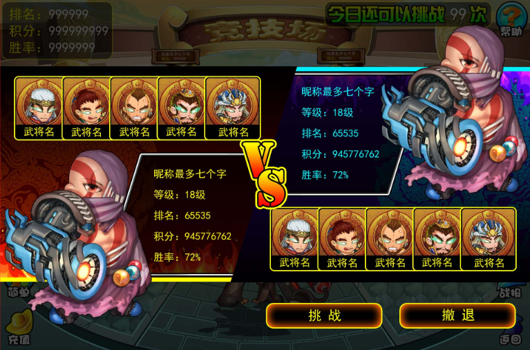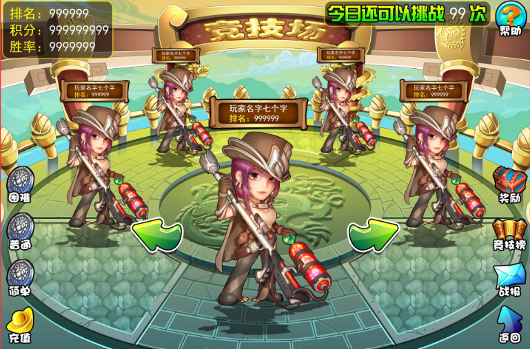 首先,竞技场为广大玩家提供竞技,交流,对抗的一个平台。玩家每天可以尝试和简单,普通,困难三组对手来进行PVP战斗。而且每场战斗都会根据所对战的对手和战斗的结果给予一定的竞技积分奖励。竞技积分越多,在竞技榜的排名就越高。 而且每天胜利一定场次,还可以获得相对应奖励。