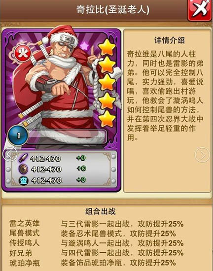 多得玩家们的鼎力支持,《火影大人》全新版本现已全面上线,主要更新内容包括增加活动“纲手之坊—大家来猜拳!”;增加新服开服活动“最强战力榜”、“等级榜”和“首充翻倍”;增加“定时充值礼包”;更新50张卡牌美术资源,调整部分UI美术;优化游戏银两产出。另外,全新圣诞绝版忍者卡牌,有着魔鬼三围之称的“圣诞老人奇拉比”将随运营活动发放给各位玩家。