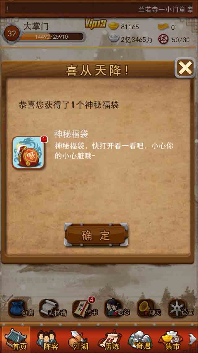 玩前摇一摇,圣诞节活动期间,《大掌门》摇一摇奖励全面升级,当首页出现孔明灯时摇动屏幕将有机率获得神秘福袋、神龙教宝盒、元宝等丰厚奖励,免费大奖从天奖,圣诞狂欢等你来哦!