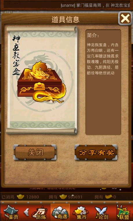 神龙教宝盒内含万两白银,开启宝盒还有一定几率获得独孤求败魂魄、纯阳无极功、九阴真经、易筋经等绝世武功。武林人士梦寐以求的珍宝尽在其中,全民疯抢就在今夜,圣诞大战一触即发,掌门你准备好了么?