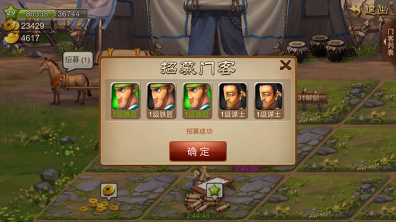 刘备得到卧龙,幼麟,凤雏等一代能人,为他打了三分之一的天下,这得益于他的知人善用。完成三国统一大业不能少了门客谋士。《乱世之刃2》开放门客系统,让英雄招待来自五湖四海的江湖侠客义士。门客系统将在“虎牢关2”通关后正式解锁,玩家每天有3次招募机会,可招募到铁匠与谋士为自己创造铜钱及经验值。随着等级的提高,“出谋划策”的门客也随之增加,铜钱与经验值每10分钟可收益一次。