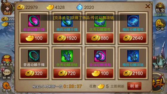当关羽身入曹营时,任何佳肴美女都无法让他心动,唯独拉出赤兔马时关羽才愁眉展开。可见英雄对坐骑装备的情有独钟。《乱世之刃2》开启的秘宝系统里的密室可随时出售8件物品,玩家花费指定的武魂、铜钱或元宝等可进行购买,把自己所喜欢的装备先收入囊中,强大自己的战斗力。