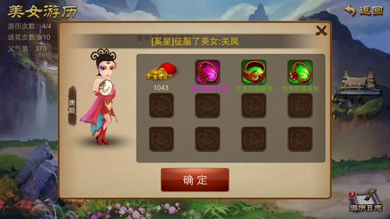 自古英雄难过美人关,英雄身畔怎能没有美女陪伴。《乱世之刃2》的美女系统是一个别具特色的玩法,玩家可以征服美女,培养美女,还可以让美女出去游玩为自己赢得铜钱、宝物等,你也可以陪美女四处逛逛,见恶霸就为其打抱不平,铁血柔情中尽显英雄气概