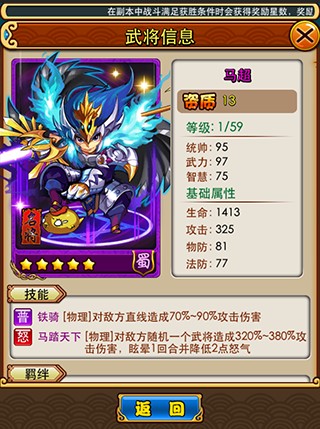 马超真的不愧是一名神将,除了几位暴力的输出,优秀的成长技能上爆发之后附带的眩晕技能,并减怒2点,使得马超能很好的控制盒点杀对面的武将。牵绊方面有曹仁的生命加成,太史慈的攻击加成,五虎上将的抱团灭人属性加成,使得马超爆发极高。遗憾的是紫书和紫马很难处,让马超难以成型,但一旦成型必为大神!小伙伴要加油呀!