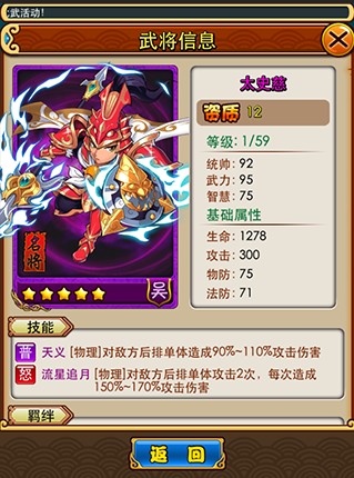 有人很奇怪为什么会选择一个12资质的武将作为推荐呢?因为太史慈作为后排输出,在进阶到7以后对后排的威胁会达到一个相当恐怖的境界。怒气攻击60%附加一次额外伤害,普通攻击80%附带一次额外50%的伤害,太史慈的这个附加,在打死对面的一个武将之后,还会自动转向另外一个攻击目标,那可是相当的只能啊!羁绊方面,马超的攻击加成,姜维的生命,周瑜等人的羁绊暂时不做介绍,因为暂时也没做出开放,紫马和蓝书的加成,依然难以成型。