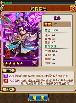 同为12资质的武将,但是后排单体的爆发加眩晕,使得不得不推荐张郃成为各位的输出武将,羁绊方面,夏侯惇生命加成,袁绍的攻击加成,紫色玉狮子和蓝色书加成。这下…你懂了吧。