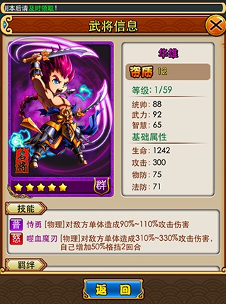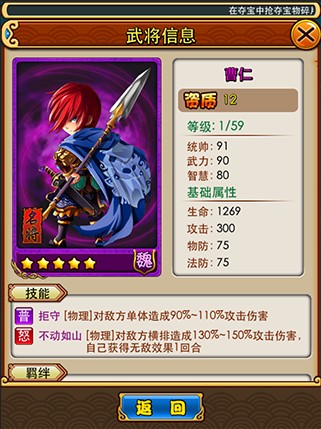 曹仁是当仁不让的第一肉。自带无敌技能,在2号位置能有效的吸收BOSS的高量伤害,进阶到4后,会习得霸道的神技牵绊,搭配马超、于禁、典韦和华雄,再加上紫书和蓝马的羁绊,让他有点不容易成型。在这里特别告诉一下各位,马超其实是比较难获得的,于禁相对来说比较容易获得一些。