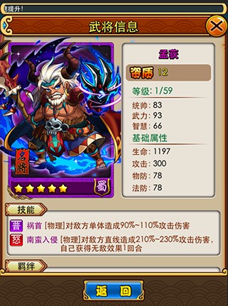 和曹仁一样,孟获也是相当的无敌。作为大蜀国的第一肉,进阶也会习得反击眩晕技能,只是20%的几率在曹仁面前就有点捉襟见肘了。如果你是蜀国阵容的话,就妥妥的加上祝融吧,能和刘备获得极大的加成,关兴这种四星蓝色武将的牵绊,也能让孟获更好的肉起来哦!更何况蓝书和蓝马羁绊很容易成型。在这里,诸葛的羁绊就不多说了,孟获作为蜀国的阵容真的是各位主公值得拥有的!