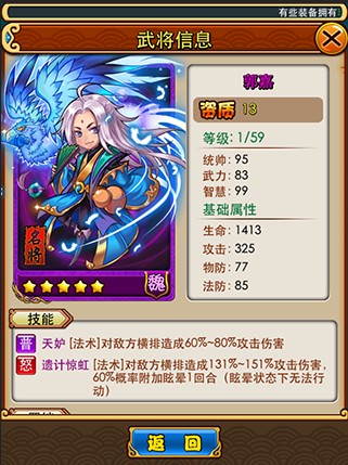 郭嘉作为前排的法术输出,附带60%几率眩晕,使得郭嘉在各个场合都能如鱼得水,如果你有幸抽到他,那你就笑一笑吧,小编当时可是花了1W金币都没有得到他,还真是牵绊问题。郭嘉没有其他阵容的羁绊,也就是说有了郭嘉,你真的就可以放心的走魏国路线。至于曹操、甄姬、徐晃夏侯的各种加成,能让郭嘉一直强势到最后遗憾的,也就只有紫书的袁梦德和魏国的主公曹操冲突了,真是一书难求啊!