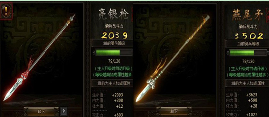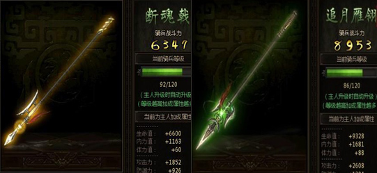 二阶:燕尾矛。通过一阶骑兵进阶后获得,需要消耗兵魂12-24个,每个兵魂的价格为20元宝。个人准备好元宝,点自动进阶。因为1阶升2阶用的是兵魂,而升2阶以上的骑兵用的是海星铁晶。但买多了以后用不着,自动进阶结束后,看元宝就知道自己花了多少了。另外骑兵到这里就变为永久了。