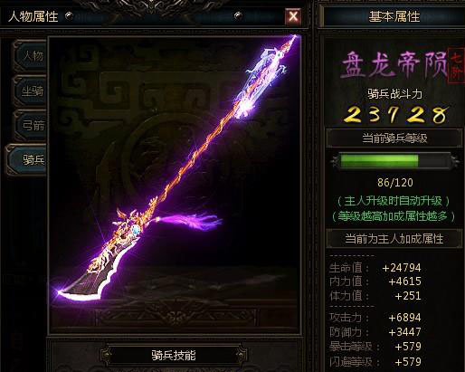 七阶:盘龙帝陨。通过六阶骑兵进阶后获得,顶级骑兵超帅。超级属性本人从未升过,有幸见证两个朋友升阶,但是具体的数据都是因为老板们不在乎并未计数,这也是本人现在自己的梦想。一般数据而言,个人建议做好准备4000海星足够。