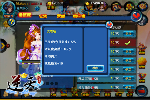 《逆天仙魔录》正是为副本而生,从一级到最高等级,副本之战贯穿整个游戏脉络,而试炼场又是游戏当中最为重要的副本。因此,试炼场副本内可以掉落大批稀有的高级材料和升级装备所用的卷轴。进入试炼场副本轻松随意,只需点开活动菜单,便可看到游戏内的诸多玩法,选择主要产出材料的试炼场便能进行挑战。