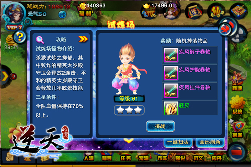 在《逆天仙魔录》中,试炼场副本可谓是让玩家玩到尽兴。试炼场是由多个副本组合起来,玩家在不同副本中可以通过打怪获取奖励。当玩家在某个副本中达成三星评价后,以后就可以针对此副本进行扫荡。扫荡也就是玩家的挂机系统,一秒时间即可清扫一整层的10个副本,而所获得的材料与奖励不变,这为玩家节约了大量的时间。