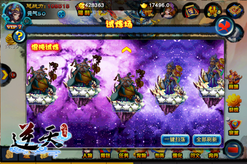 在《逆天仙魔录》中,试炼场,宠魂塔、竞技场PK、下多人副本,阵营击杀,跨服战场一直是广大游戏玩家们最热衷的玩法,但主角永远只有一个,精彩玩法太诱惑,很多玩家纷纷感叹分身乏术,其中试炼场自带的一键全扫荡功能,是所有PVE与PVP玩法里面所需要时间最为省事的。