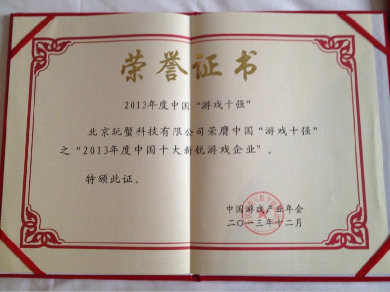 2013年12月27日下午,中国游戏产业十强盛典最终获奖名单在中国游戏产业年会大会现场正式公布。玩蟹科技独揽“2013年度中国十大新锐游戏企业”和“2013年度十大最受欢迎的移动原创移动游戏”两项大奖,成为今年“游戏十强”获得奖项最多的移动游戏企业之一。