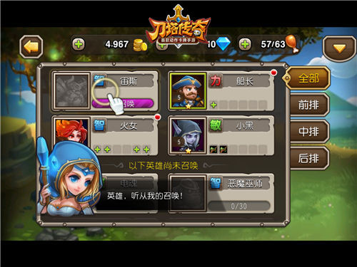 玩家进入游戏后,将会获得系统提供的船长,小黑,火女三位英雄,但是团战最多可以派遣5位英雄,现在还缺少两位英雄啊。哈哈,大家不要着急,游戏中,玩家只要收集足够的灵魂石,就能召唤神龙!啊,不对……在收集了足够的灵魂石,就能召唤新英雄!