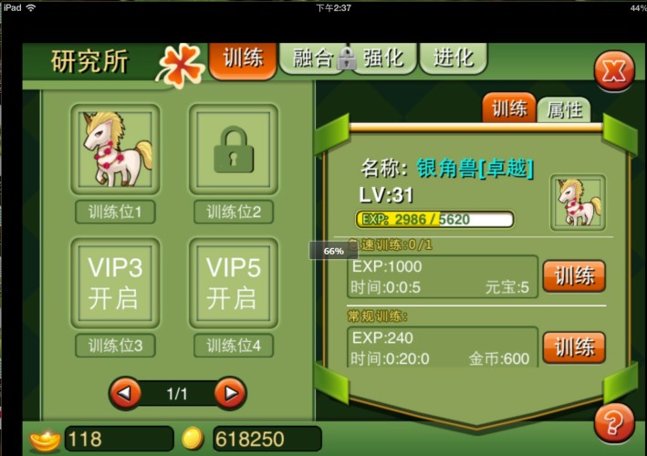 “训练”是宠物获得经验的重要途径,又分为“急速训练”以及“常规训练”,进入研究所之后点击训练栏并选择想训练的宠物进行训练。每个玩家初始都拥有一个训练栏,以后会根据等级变化增加一个。玩家也可以通过充值成为VIP用户来增加训练栏。
