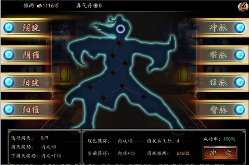 打通经脉最好是循循渐进,如果前期只看中一两条经脉的属性,抱着不撞南墙不回头的态度,硬要把这一两条经脉的所有穴位冲满九个周天,那无疑会浪费很多真气丹和银两。所以前期可以利用有限的银两和真气丹,将每个穴位都运转几个周天,这样可以获得最大的收益,也方便了后期更好的收集银两和真气丹,为挑战大圆满的境界冲击!