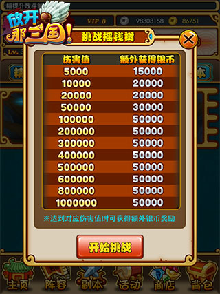 当各位主公角色等级达到25级后,就可以进入摇钱树系统了。摇钱树系统就藏在游戏副本界面中的活动副本中。方法很简单,只要对着那棵华丽的挂满钱的树攻击就行啦,我们这可是凭本事赚钱的!