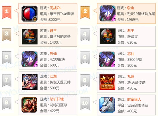 本周道具排行榜出现了一笔8K的道具交易。相比于上期2800的君王武器,本周问战OL的“镶宝石飞龙套装”显然更加符合我们对土豪的定义,下面让我们一览土豪装的真容: