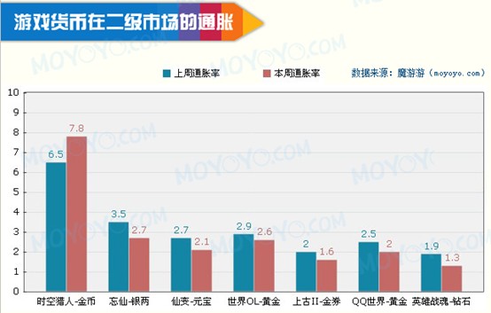 本周的游戏货币通胀率与上周相比没有太大变化,除了一款很热门的游戏——时空猎人。 时空猎人本周的金币通胀率上涨至7.8,增长率为16.7%;小编推测是一小批玩家退游,魔游游上甚至有人高于1:150的比例在抛售时空金币,在一定程度上拉高了时空的比例。其他游戏货币在二级市场的通胀率与上周相比变化不大,在之前的基础上甚至小有下降,可喜可贺。持续提升的通胀率给游戏的可持续性敲响了警钟,后面的换手率分析同样也印证了这一点。*数据来源于淘宝、职业中介与三方平台,由魔游游(moyoyo.com)整理发布。