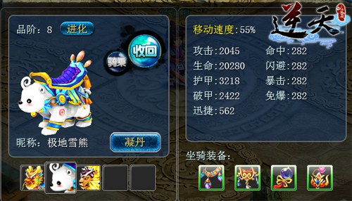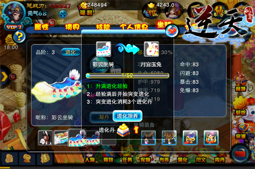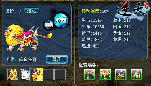坐骑进化新功能:在坐骑界面使用进化功能可消耗坐骑进化丹促发坐骑进阶化形,进化成功后不仅可获得新外观,属性也将获得大幅提升。同时,多余的坐骑可通过凝丹功能凝丹为坐骑进化丹,再度用来进化新坐骑!