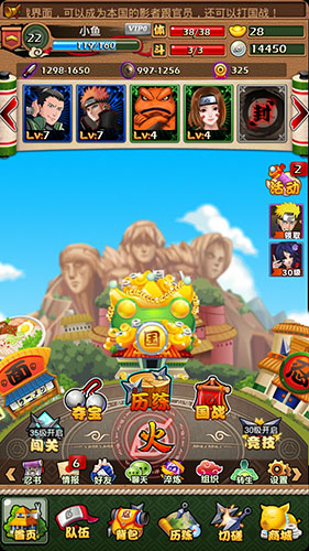 纯正火影特色UI系统,《火影大人》,你值得拥有。超自由顺畅的“面馆”、“忍者招募”特色滚动按钮,国战五大国专属身份设计,优秀忍者、装备、忍术卡牌美术设计,超炫忍术大战画面,让你如飞雷神的速度瞬间爱上这款手游大作!