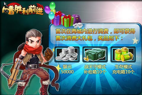 忘掉现实中的不愉快,在《向着胜利前进》中和小胜亲密接触:首次在商城中进行消费,就可以获得首消大礼包,你想要的丰盛和满足,一次性统统给你!