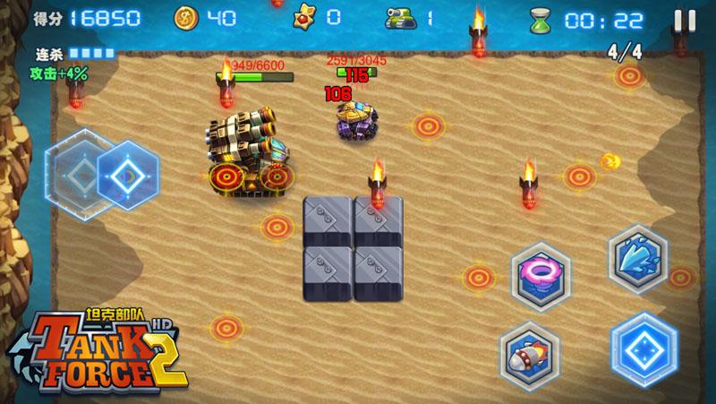 《坦克部队2》中还有许多坦克大战中没有的玩法,比如游戏中的坦克能够升级,还能够装备配件,学习技能,从而使得坦克的战斗力不断提高,闯关战斗更加激情。此外,游戏中还有极具挑战性的BOSS关卡,实力强大而且智能很高的BOSS,非常考验玩家的战斗策略和操作走位。