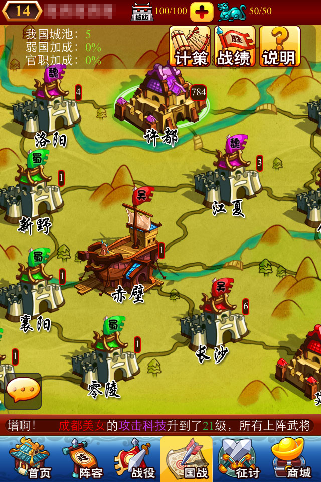 等你选好势力开始开战的时候,国战的焦点就是战场中的城池了。除了每个国家的首都外,整个地图还有13个城池。而最中间的赤壁则是战场的焦点, 每天占领赤壁最久的国家将额外获得奖励。