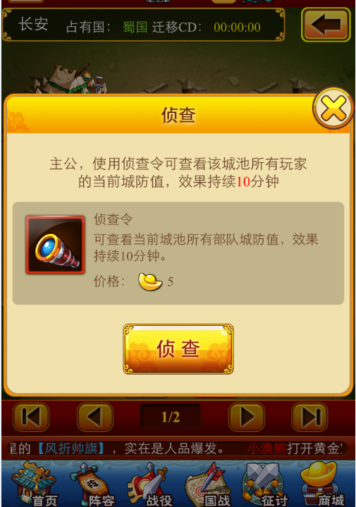 当然你只有先占掉临近的空城池或迁入,你可攻击临近城池的敌国玩家。每个城池右方的数字代表其中所含的部队,而颜色则代表所占有的国家。临近的空城池或本国城池之间可进行迁移,但是每次迁移后需要20小时进行冷却,不过你花费虎符可消除冷却时间立刻再次迁移,每次需要花费20个虎符。